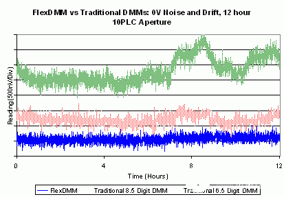 在大多数传统数字万用表中的主要测量误差源是电磁继电开关。由于接触感应的热电压偏置可能会导致不稳定和漂移。FlexDMM设备去掉了除了DCV、ACV和电阻回路中的一个继电器之外所有的继电器。在这个继电器中,特殊的继电器接触配置能够抵消热误差。这个继电器只有在自我标定的时候才打开。所有用于函数和范围变换的测量相关的开关都是由低温、高可靠性的固态开关完成的。因此,电磁继电器老化问题能够完全消除。图6显示了最为灵敏范围100 mV范围内,一昼夜的性能漂移。每个分割是500 nV。在相同条件下,使用传统的六位半数字万用表和全机架八位半数字万用表的相同测量结果如图6所示。