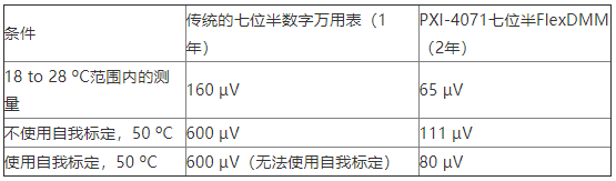 注意使用带有自我标定功能的FlexDMM在50 ºC下的精度,相比传统方法而言提高了七倍。表4将自我标定与传统的“工厂”标定进行了比较。
