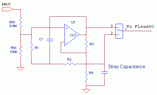 PXI-4071 FlexDMM利用创新的分级设计去掉了在传统设计中降低宽带宽性能的衰减器电容。这个环节在图8中显示,经过仔细的设计和布局,最小化寄生电容,能够负载输入衰减器网络RN的100 kΩ衰减器。使用附加的由R1-R4以及U1构成的分级环节,可以确保平稳的阶跃响应。更为重要的是得到的特征响应与单极RC十分接近,这对于数字化仪和直流阶跃响应是十分重要的。