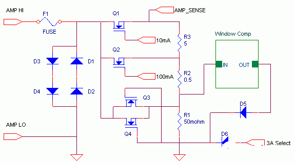 为电流范围选择使用固态设备,可以在较小的物理空间中达到更高的可靠性和改进的保护。此外,两种电流范围选择设备Q3以及Q4,实际上是在过载时工作,从而可以保护高稳定性的电流传感电阻,为最为苛刻的应用提供所需的鲁棒性。