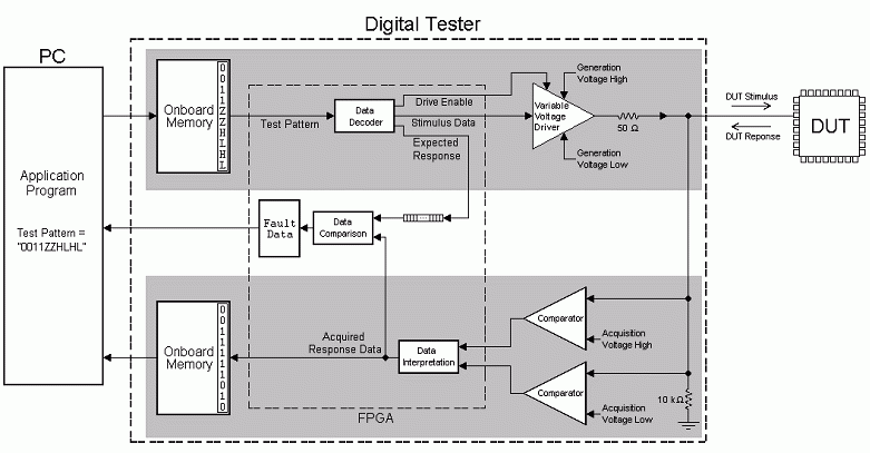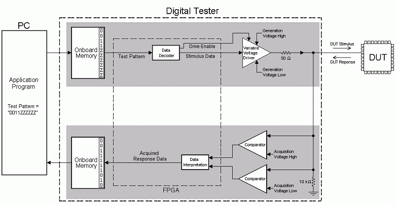 在完成信号采集之后,数据解码电路判断采集信号是逻辑低还是逻辑高,并将结果存储在板载存储器中。采集得到的响应数据最终被写入PC中,进行分析和记录。下一章节将这个方块图进行进一步扩展,引入了NI 655x设备能够对采集响应数据进行直接比较的特性。