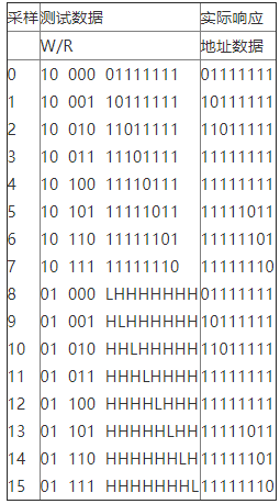 如前所述,典型的存储器集成电路包含三条地址线、八条数据线、一条写启用(WE)线和一条读启用(OE)线。表2显示了一组可以用于测试这块SRAM芯片的数字测试模式。