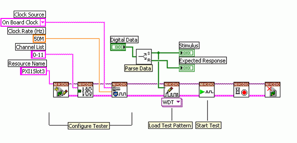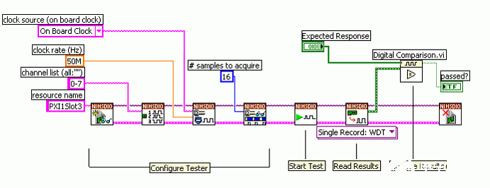 NI LabVIEW是一种图形化编程语言,下面用LabVIEW展示了NI 655x设备的数字软件比较应用的功能。下面的几张图片展示了如何建立独立的发生操作和采集操作,以及如何将它们合并在一个同步功能测试应用中。