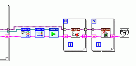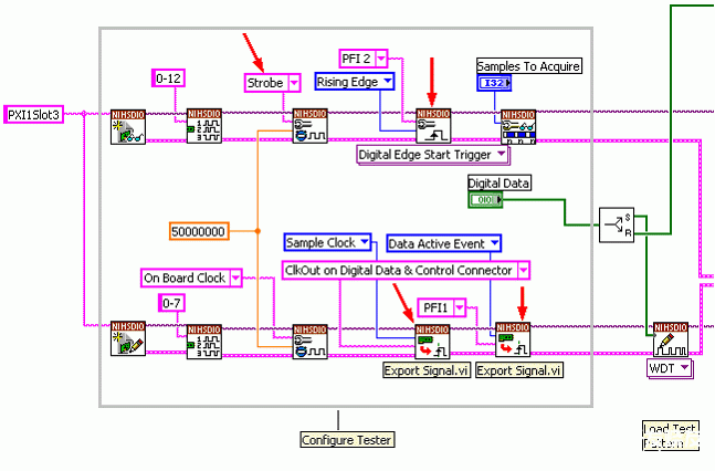 图9显示了配置和外部路由数据活动事件和采样时钟的LabVIEW程序。标有箭头的函数可以完成所需的额外配置。