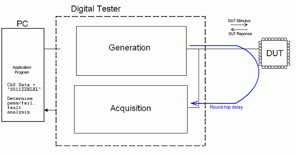 尽管NI 6552支持这两个程序同时工作,但是简单地将它们组合在一起并不是有效的测试方法。简单地同时运行我们的采集程序和发生程序并不能将采集数据与预期响应数据对齐。由于这些程序运行在非确定性软件中,您无法依赖程序的定时来保持一致性。此外,通过被测设备和连接被测设备电缆的传递延迟也必须考虑。数据从数字测试仪通过电缆和被测设备流回测试仪所需的时候称为全程延迟,在图7中标出。