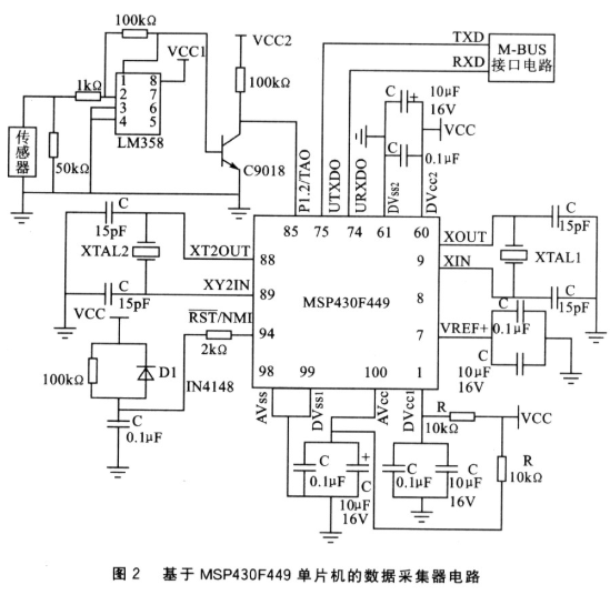 基于MSP430F449单片机的数据采集系统电路原理图分为两个部分:数据采集模块和通信模块。