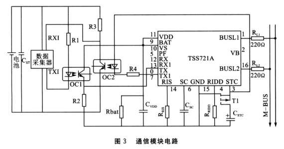通信模块即单片机和总线集中器之间的数据传输电路,如图3所示。TSS721A是美国德州仪器公司1999年初生产的一种用于M-Bus的专用收发器芯片。其内含的接口电路可以调节仪表总线结构中主从机之间的电平,可通过光电耦合器等隔离器件与总线连接。该收发器由总线供电,对从机不增加功率需求;外形采用16脚双列直插封装,将整个数据发送功能集于一体。其特点如下:①满足国际ENl434-3标准;②具有动态电平识别的接收逻辑;③通过电阻可调接收电流;④无极性连接;⑤防掉电功能;⑥可提供3.3 V稳压源;⑦支持远程供电;⑧半双工下波特率可达9600 bps;⑨支持UART协议;⑩从机可由总线或后备电池供电。该芯片上有8位拨段开关,用来设置总线上表具的惟一地址。而作为Master的主机存储各采集器模块的地址,并根据主控机的请求将采集模块的数据抄上来。集中器设置各采集模块的分频系数和各表的量纲和倍率。