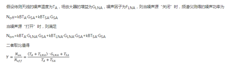 天线噪声温度表征了,在给定环境和俯仰角时,天线端口输出噪声功率的能力!因此,可以将天线本身当作一个噪声源,通过引入场放大器大器表示噪声源打开,取掉场放大器大器表示噪声源关闭,于是也可以使用Y因子法测试,这是本文介绍的测试方法的思路。