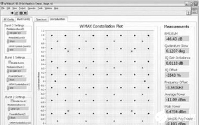 图3 其他测试供货商的昂贵RF仪器相比,16-QAM EVM测量的WiMAX星坐标绘图更具竞争力。