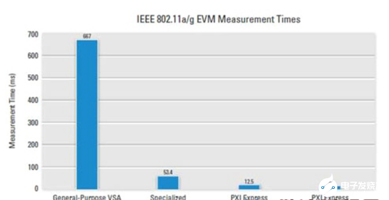 图1针对不同的RF信号分析仪,比较54Mbit/s数据传输率之下的EVM操作与功率测量操作,其使用WLAN的测量时间长短。NI LabVIEW软件的PXI WLAN测量系统中,其高性能多核心处理器在执行大部分的IEEE 802.11a/b/g测量时,会比传统的矢量信号分析仪与专业WLAN机箱快上约五至十倍的速度。