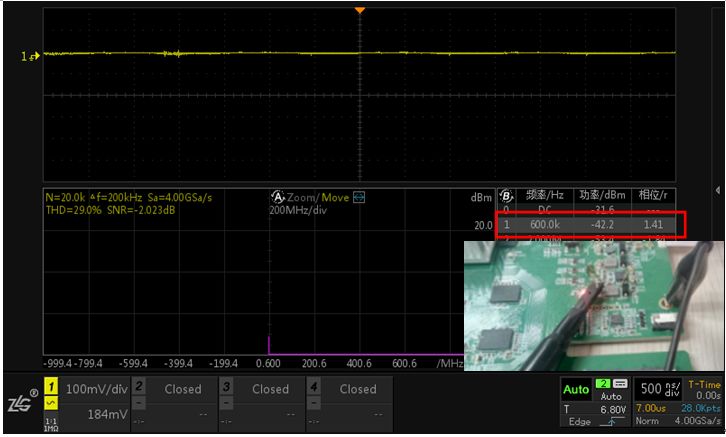 注:通道1信号幅度虽然非常小,但通过FFT分析还是可以定位出600K频点的干扰。
