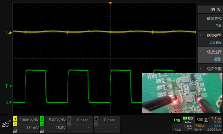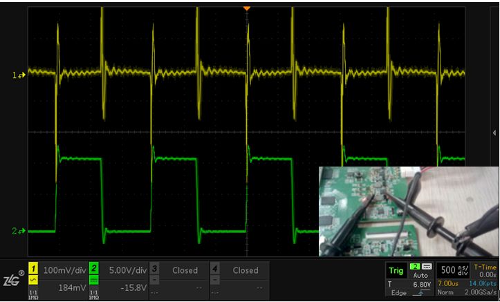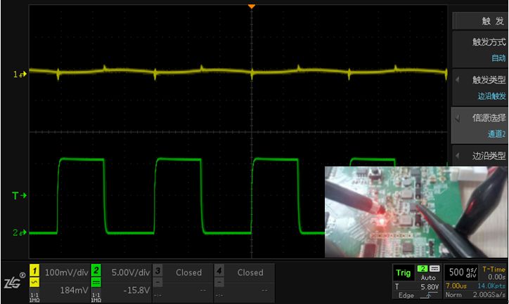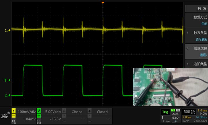 图3 CH1使用夹子测量电源输出,CH2使用夹子测量电感,单点接地