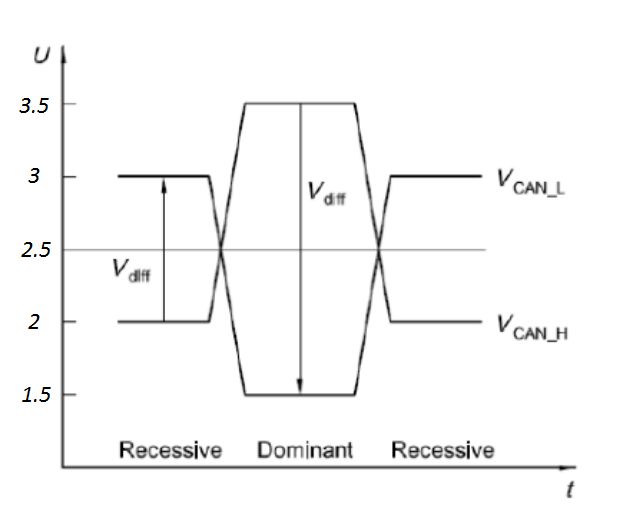 在接收状态,VCAN_L和VCAN_H固定在平均电平,由总线终端决定。Vdiff低于最大阈值时,接收状态在总线空闲和接收数据位期间传递。