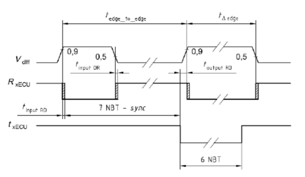 内部延时tnode测量应当在通过在空闲状态,错误有效的CAN节点的CAN总线输入一个发送位。CAN节点应当认为这个发送位为帧的起始位并执行硬件二次同步。CAN控制器应当在发送位后的第六个接收位检测到填充错误,并且作为有效的错误标志响应。外部发送发送位到错误标志开始之间的时间为tedgeotooedgeoo。