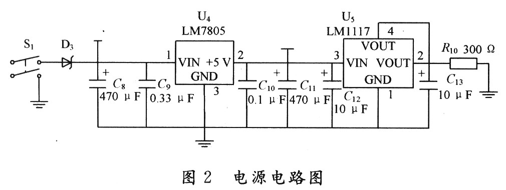 不同芯片对供电电压的要求也不同,本测试系统中,单片机P89LPC938所需的电压为3.3 V,而电平转换芯片MAX232所需要的电压为5 V,因此,电源模块的设计要满足需求,设计时就需要兼顾两者,外部只需提供12 V电压即可。图2给出电源电路的电路图,本系统选用LM7805和LM1117两个稳压器。