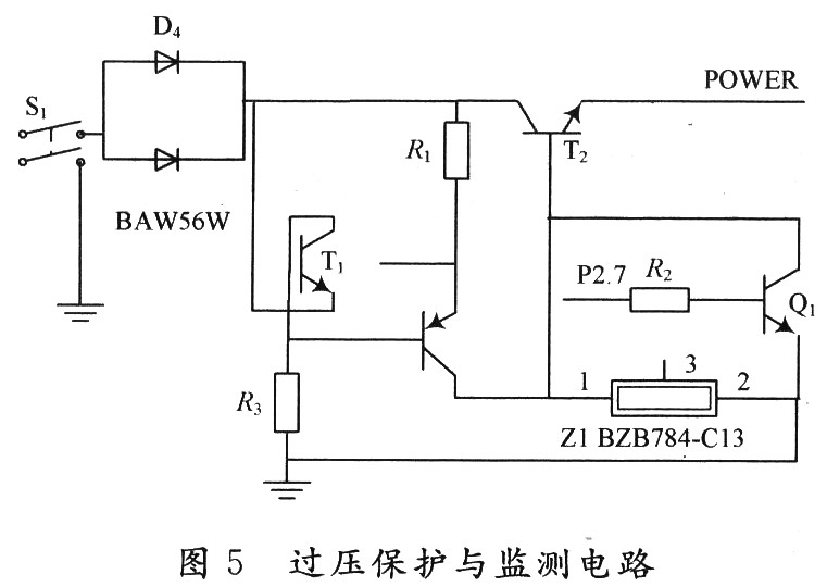 燃料开关外部需+12 V电压供电,经产品内部电源电路转化为+5 V电压给单片机提供电压,因此如果其电源电路出现故障,或受到汽车内其他电器设备的电压干扰使提供给单片机的电压过高,或由于其他形式的制造缺陷,都有可能使被测开关的电源异常,这会损坏燃料开关,进而损坏与相连接的测试系统。因此,需要设计一个过压保护与检测电路,检测燃料开关内的单片机的电源电压,当此电压正常时(+5 V±2%),测试系统可以继续对其检测,但当此电压过高,则自动切断燃料开关的外部电源,达到保护燃料开关的目的。图5即为该保护电路。