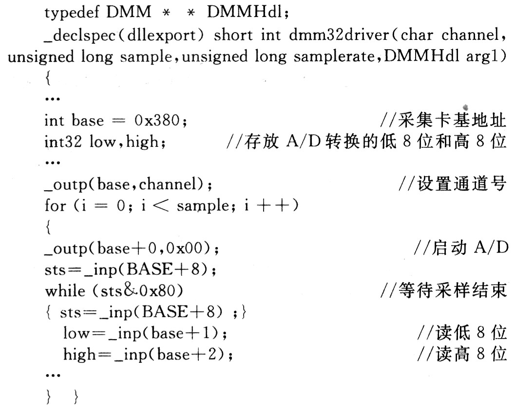 使用VC++生成一个dmm32driver.dll的动态链接库,通过CLF节点对其调用,以实现该数据采集卡的驱动,该程序实现的主要源代码为: