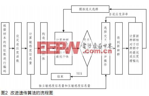 传统的遗传算法存在早熟收敛、非全局收敛以及后期收敛速度慢的缺点,为此本文提出了一种能够在进化过程中自适应调节变异率,以及利用模拟退火防止早熟的改进遗传算法,同时该算法利用敏感度信息可以有效地控制遗传操作。图2是改进遗传算法的流程框图。