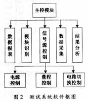 编程中的事件驱动机制。LabWindows/CVI中对事件的处理方法也有两种,即回调函数法和事件循环处理。我们在该测控程序中主要采用回调函数法。回调函数法是开发者为“软面板”上的控制项编写的一个独立函数,当选中某一个控制项时,就调用相应函数对此事件进行处理。本测试软件功能的实现主要通过主程序控制模块调用相应的子程序实现,子程序主要包括信号源控制、测试数据采集及处理和结果分析等。具体的软件结构如图2所示。