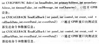 LabWindows/CVI中的GPIB函数库可以实现打开和关闭GPIB设备、总线配置、I/O读写、GPIB设备控制、总线控制等功能。GPIB函数库既包含了上层函数又拥有底层函数。上层函数不需要访问相应的底层协议就可以实现总线控制,但其功能有限;而底层函数可以更为灵活的控制总线,但是需要了解相应的底层协议。在本系统中,所采用的测控仪器都具有GPIB通讯接口,通过三个主要的函数来实现仪器间的通讯和控制: