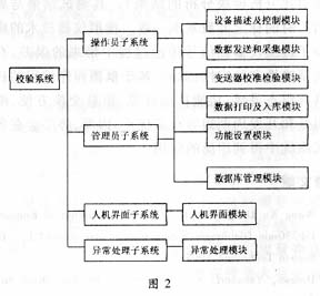 根据自动校验系统要求实现的功能,将软件分为4个子系统和8个模块(如图2所示)。?