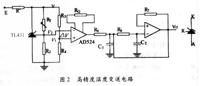 AD524作为温度变送器的放大电路,其增益可由外接电阻RG调整,RG的温度效应将 引起AD524放大倍数漂移或精密度等级下降,在高精度控温系统中,必须对增益电阻的温度 效应进行补偿,具体设计方法见文献[2]。