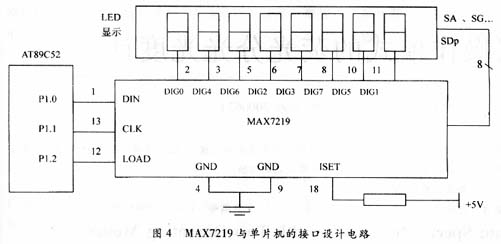 传统的LED驱动电路往往是靠并行芯片连接实现的,这种连接方法使用的集成芯片较多,电路也较复杂。本文介绍的驱动电路是由MAX7219集成芯片来实现的。该芯片是串行输入/输出共阴极显示驱动器,一片MAX7219就可以驱动8个七段数码管显示信息。其引脚及与AT89C52的接口见图4,其中: