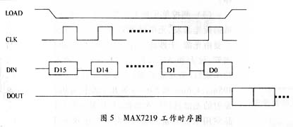 MAX7219通过3个引脚与CPU相连。它的工作时序如图5所示:当LOAD变为低电平时,将16位数据串行送到DIN端,在每个CLK的上升沿把数据移到内部寄存器,在CS的上升沿把数据锁存到数字控制寄存器,在16.5个周期后,数据出现在数据输出端,在CLK的下降沿将数据输出。?