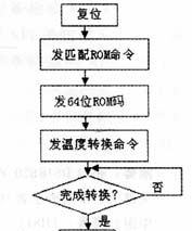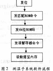 汇编语言编写,主要完成对DS18B20的读写操作,实现实时数据的采集,并获取最终温度值送至单片机内存。但需要注意的是,由于DS18B20的单总线方式,数据的读写都占用同一根线,所以每一种操作都必须严格按照时序进行。图2为测温子系统流程图。单片机首先发送复位脉冲,该脉冲使信号线上所有的DS18B20芯片都被复位,接着发送ROM操作命令,使得序列号编码匹配的DS18B20被激活。被激活后的DS18B20进入接收内存访问命令状态,内存访问命令完成温度转换、读取等工作(单总线在ROM命令发送之前存储命令和控制命令不起作用)。