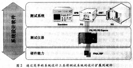 FPGA(现场可编程门阵列)上设计硬件。这一技术也将最终提供这样的一个独立环境,使用户可以从设计测试系统到定义硬件的功能,如图2所示。测试工程师将能使用合适的功能来进行系统级的设计。当他们需要定义专门的测量功能时,可以用同样的软件工具来“细化”到合适的级别以定义测量的功能。例如,可以开发LabVIEW程序来使用模块化仪器进行某些测量,如