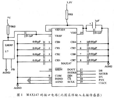 A/D芯片MAX147是一种具有8路通道,12位精度的串行数据转换器。可以工作于SPI和QSPI方式。输入电压范围:0~2.5V(或-1.25V~+1.25V)。采样频率可达133kHz。MAX147的管脚定义见图1。CH0~CH7为8路