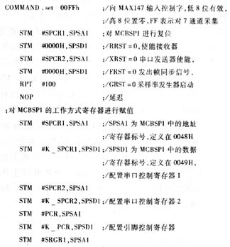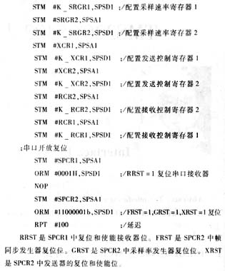 编程时,首先要复位MCBSP串口,其次是配置一些16位寄存器,设置控制和收发寄存器中各位的值。配置好寄存器,对串口的操作实际上就变成了对寄存器DRR和DXR的操作,发送数据就是对DXR进行写操作,接收数据就是对DRR进行读操作。MCBSP支持包括8、12、16和32位字长格式的数据收发。编程复位和配置寄存器的程序如下: