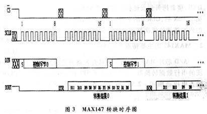 转换器空闲时出现第一个高电平或在第5位A/D转换数值后出现的第一个高电平,MAX147都判断为起始位。图3所示为16时钟周期转换时序。