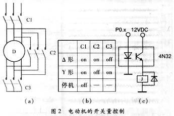 电机的开关。为满足星角切换和开机/停机要求,需要对3只交流接触器(C1~C3)按一定组合关系进行控制,其