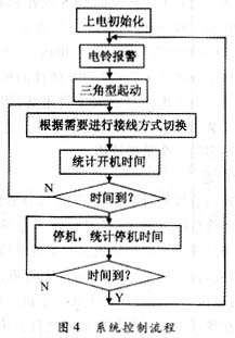 仪器上电初始化后,首先发出电铃报警预示电机即将起动;随后电机以三角形方式起动以满足抽油机重载起动的要求;起动后系统将根据电机的实时功耗情况使电机在三角形、星形或过载停机三种状态间自动切换,即在实时功耗小于设定三角形向星形切换功率时电机工作在星形方式,在功耗大于设定星形向三角形切换功率时电机工作在三角形方式,大于设定过载功率时停机;如果系统中设置了间歇控制参数,则系统还将对开机和停机的累计时间进行计时,实现定时控制。上述过程周而复始进行,直至人工干预停机为止。