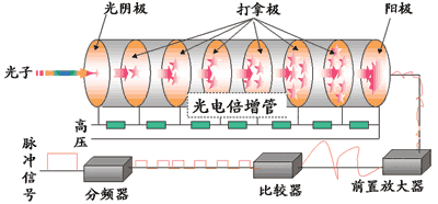 光子检测装置的核心是光电倍增管,其各电极之间均加有规定值较高的直流电压。当光子打到光阴极时,由于光电效应的作用,其表面可以产生能量微弱的游离电子,称为光电子;该电子在直流高压产生的电场作用下离开光阴极,同时被加速,再次打到打拿极上并产生出能量更大数量更多的光电子,就这样经过多个打拿极的反复放大,最后使阳极产生电脉冲信号,该信号经前置放大器放大,在经比较器去除噪声信号,最后由分频器换算出光子脉冲数,如图3所示。