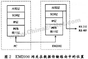 本应用中使用的是EM2000网关,他是用来在嵌入式系统与互联网建立数据连接和协议转换的设备。一方面PC端的网络应用程序将应用层数据打包成为IP包在网络上传送,EM2000将辨识和解析这些数据包,把应用层的原始数据转发至RS 232接口。另一方面EM2000也将RS 232接口的数据封装成为IP包,传送至PC端的网络应用程序。支持透明传输和简单协议两种工作方式;EM2002网关在网络接口部分具有WWW接口,用户可以通过浏览器在网络上实现对EM2002及串行设备的配置和管理。在网络中的具体位置如图2所示。