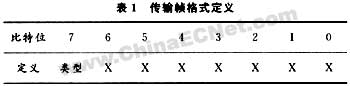 传输帧格式的定义如表1所示。第7位为类型定义位,“1”表示为数据帧;“0”为命令控制帧。