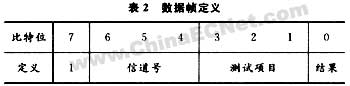 数据帧格式的定义如表2所示,主要用来传送检测的数据结果。根据需检测信道数量和检测项目来设置数据帧的字节。本系统设置8个数据信道,8个测试项目和“正常”/“故障”2个参数。