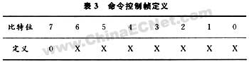 命令控制帧的格式定义如表3所示。字节的最高位固定为“0”,主要用来传输测试终端和远端诊断终端的控制命令和设备状态信息。
