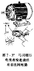 用钳形电流表小量程,钳测一接近满度的电流,这时在钳口中,套入被检查线路,如读数下降,则说明有短路匝存在,且下降值和短路匝数成正比。测试方法如图7-37(a)所示。