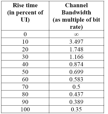 3, 对串行数据信号而言,数据比特率和上升时间是最重要的两个因素。有一个非常好的评估准则是:示波器的带宽 > 1.8 X 信号比特率. 在这个准则下,如果被测信号的上升时间>20%UI,那么1.8关系的带宽能捕获信号能量的99%. 下面的图表给出了不同的上升时间和带宽之间的关系。