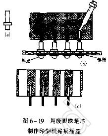 取用完了油墨的圆珠笔芯数支,将其珠头截下,锉平,用汽油洗净,如图6-19(a)所示。然后用锡将它焊在打孔的敷铜板上,这样便作成了如图6-19(b)所思的插座。再取数根Φ0.8mm左右的铜丝,分别插入插座内,然后把它们焊在另一块覆铜板上,如图6-19(b)所示。待全部焊毕之后,一提起印制线路板,铜丝与插座分开,用刻刀将铜丝以铜丝之间的敷铜板割一道槽分开,这样,插头便作好了。