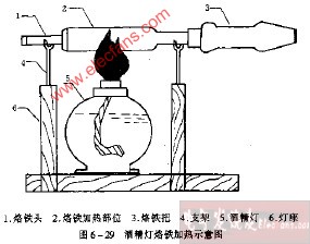 酒精灯烙铁属于火烙铁的一种,在无电的偏僻山村或停电时的城市,仍有它的用武之地。其外形及加热时的情形如图6-29所示。