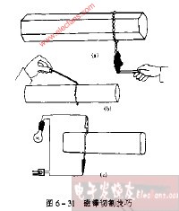 参见图6-31(c)。首先在磁棒需要切割处用铅笔画一圈,然后找一只100W的白炽灯泡串接两支万用表笔,并用这只表笔分别接触磁棒上铅笔线的两对角点。刚通电时,电灯泡发暗红色,以后逐渐发亮,在磁棒上铅笔画过的地方,因为通过电流而发热,致使磁棒断裂开来。