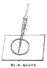 这是在业余条件下常见的一种方法,即先在层压板上用圆规把大圆孔画出来,然后用手电钻或手摇钻沿大孔内侧密打一圆小孔,如图6-80所示。