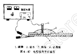 作法是:先将刻金属板除锈,去污、去油渍,晾干后将要在金属板上刻的字后图形,用铅笔描出来,然后放在火上将金属板烘热涂上一层蜡,待冷却后用刻刀将字或图形上的蜡刮掉,露出金属。这样,凡是需要刻的字的图形就低于蜡面,形成凹处。将凹处倒入食盐水,将溶解的表面张力作用下,食盐水高于蜡面。找一根五号电池碳棒,用导线将它与直流稳压电源(输出6~9V)的负相相连,稳压电源的正极用鳄鱼夹夹在金属板上。接通电源后,手持碳棒使它保持在盐水表面上,几分钟后,金属板面在电解的作用下便形成了一层凹形字或图案。