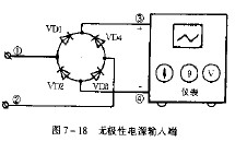 某些仪器仪表,要求接电源时极性绝对不容有错。这时,可用四只整流二极管组成桥式整流电路,用作无极性电源输入端,电路如图7-18所示。