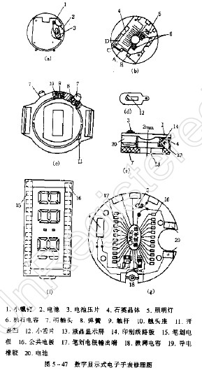 电子手表对时完毕,过了一段时间,显示屏显示又从1:00时刻走起,日历复位1月1日。出现这种现象的原因一般是由于CMOS电路印制线路板上的石英晶体受到某种振动,使它瞬时失效而引起的。电子手表突然停止振荡一瞬间,破坏了它的工作条件,使之显示全部复位。修理方法:只须更换石英晶体即可。石英晶体所在位置如图5-47(b)所示。