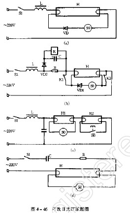 普通日光灯在电压200-170V时,或在冬天里就难于启辉。如果在日光灯电路中如图4-46(a)所示,加一只二极管,那么即使在冬天里电压降到170V,灯管也能迅速启辉、点燃。图4-46(a)中,VD为2CP或2CZ型硅整流二极管,要求耐压400V以上,额定电流为1A以上。也可以用1N4006硅整流二极管。串联在启辉器回路中的VD起半波整流作用,使镇流器的感抗下降,从而使回路电流增大,也就增大了灯丝的预热电流,灯丝产生的预热电流,灯丝产生的热电子数量增多,这样灯就容易启辉。没有串入二极管VD时,启辉器在低压下要闪跳2~4次才能启辉;而串了VD后,启辉器闪跳一次就能使灯点燃。